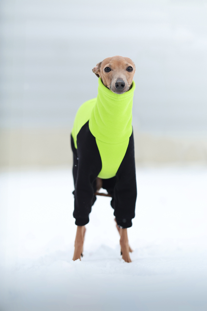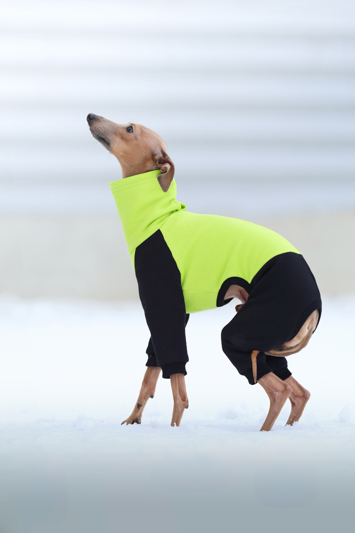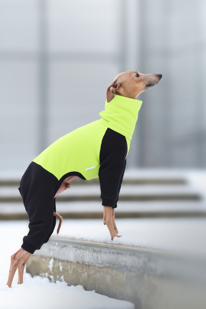 Nasz kombinezon dla charcików włoskich w kolorze neonowej limonki łączy funkcjonalność, wygodę i nowoczesny styl. Wykonany jest z wysokiej jakości dresówki drapanej, która od strony wewnętrznej posiada miękki meszek, a naturalne włókna bawełny zapewniają odpowiednią cyrkulację powietrza, utrzymując psa w optymalnej temperaturze podczas spacerów i codziennych aktywności.