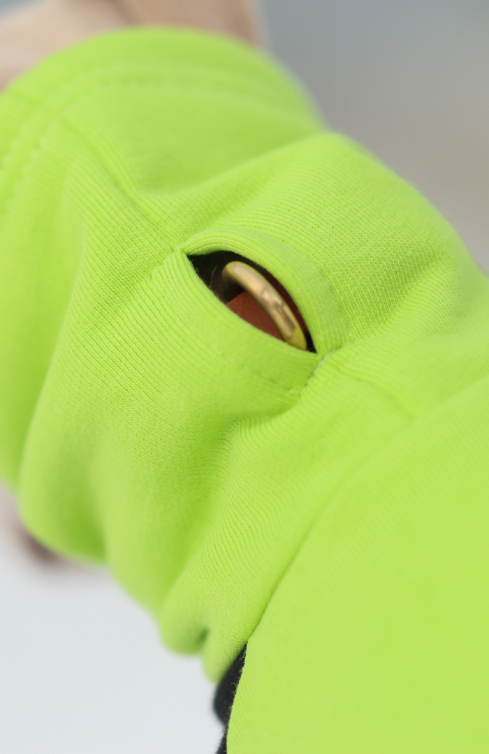 Całość ubranka wykończono czarnym ściągaczem, a w kołnierzu znajduje się praktyczny, obszyty otwór do podpięcia smyczy, ułatwiający codzienne spacery.