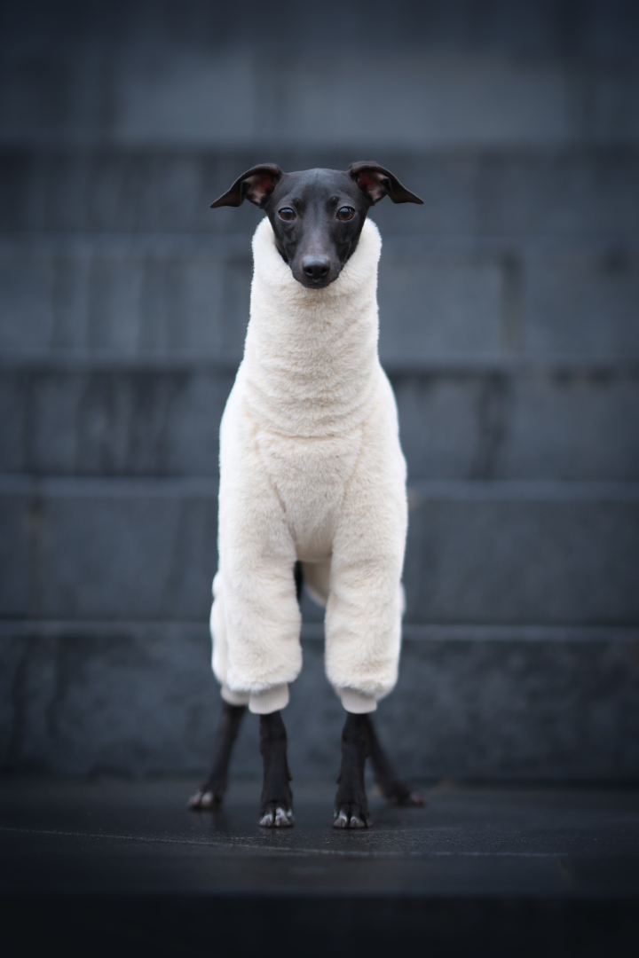 Nasze kombinezony powstają z wysokiej jakości dzianiny futerkowej o gęstym, krótkim włosiu. Materiał jest wyjątkowo miękki i przyjemny w dotyku, dzięki czemu doskonale otula charcika włoskiego w chłodniejsze dni. Dla dodatkowego komfortu oraz lepszej ochrony przed zimnem kołnierz wykonaliśmy z podwójnej warstwy futerka.