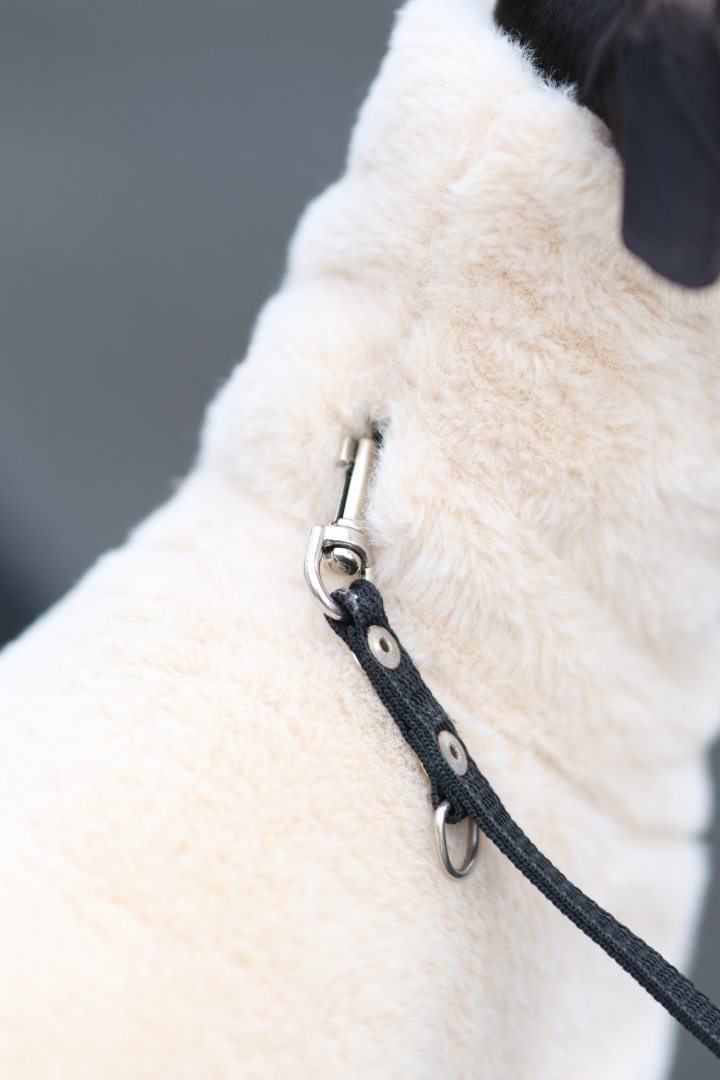Każdy kombinezon wykończony jest estetycznym, kolorystycznie dopasowanym ściągaczem. W kołnierzu umieszczony został praktyczny otwór na smycz, który ułatwia codzienne spacery.