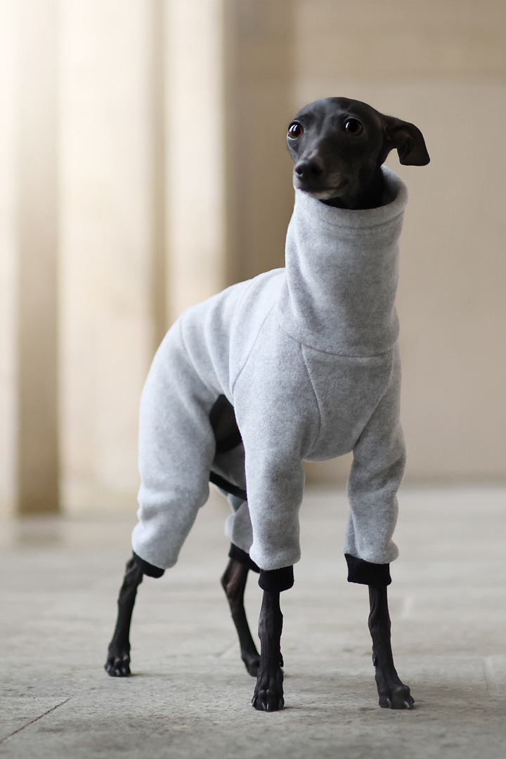 Ubranka projektujemy z myślą wyłącznie o charcikach włoskich, dlatego ich krój idealnie odpowiada tej wyjątkowej, wymagającej sylwetce. Dzięki zastosowanym materiałom kombinezon jest łatwy do założenia, wygodny i nie krępuje ruchów, co pozwala czworonogowi swobodnie biegać, bawić się i odpoczywać.